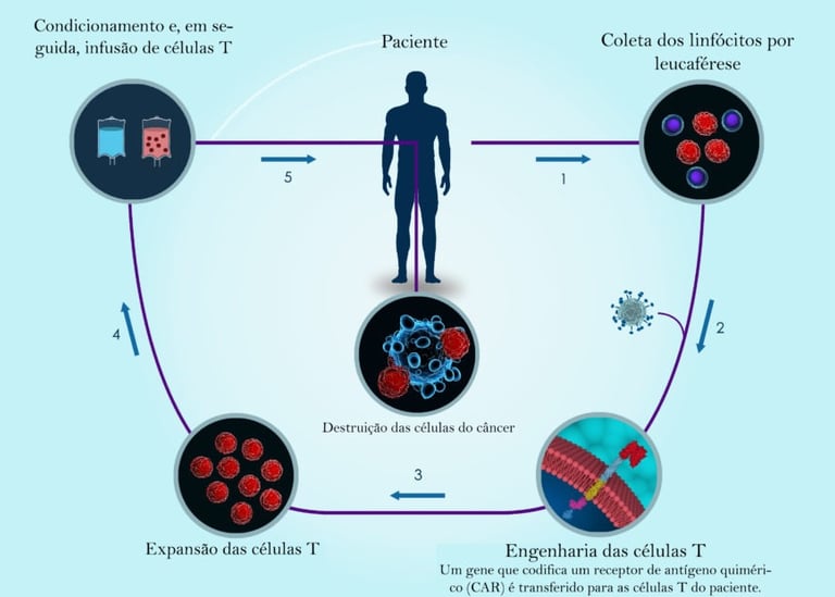 A terapia gênica Car-T Cell é um dos tratamentos mais modernos no combate ao câncer, aprovada pela Anvisa desde 2022. Ela reprograma células de defesa do paciente para atacar tumores e já demonstrou resultados expressivos, especialmente em casos de leucemia linfoblástica B, linfoma difuso de grandes células B e, mais recentemente, mieloma múltiplo.